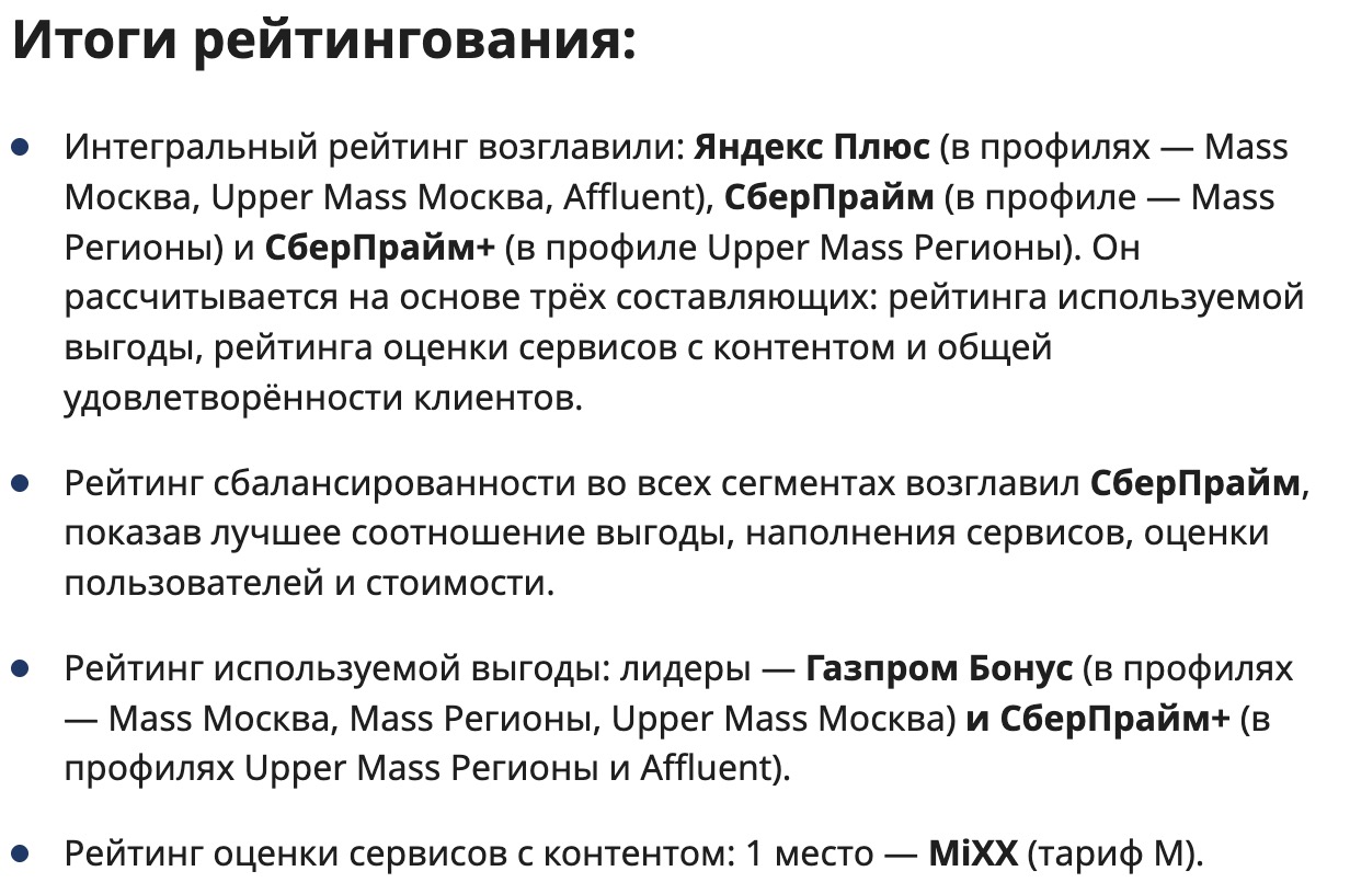 сегодняПодписка СберПрайм заняла первое место в рейтинге мультисервисных подписок аналитической компании Frank RG. Эксперты признали её лучшей в номинации «Самая сбалансированная подписка» благодаря оптимальному сочетанию стоимости, наполнения, пользовательских оценок и реальной пользы. По итогам 2025 года сервис также стал лидером интегрального рейтинга в регионах, а СберПрайм+ вышел на первое место по уровню используемой выгоды среди клиентов с высоким доходом.