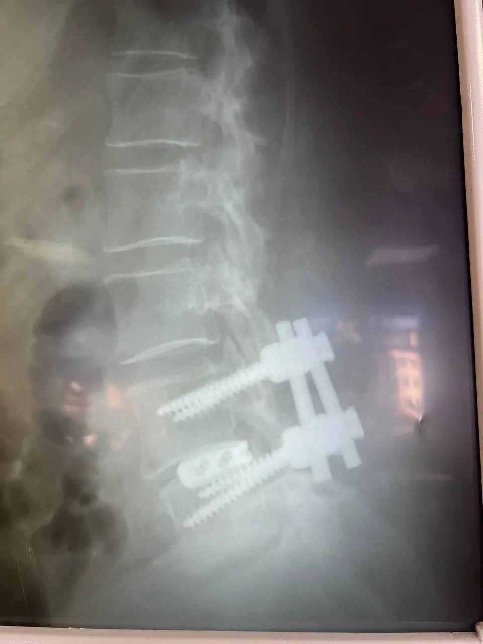 Во время хирургического вмешательства врачи устранили сдавливание с двух сторон, удалили грыжу и заменили поврежденные диски имплантами. Используя микрохирургическую технику, оптический прибор и специальный инструментарий, специалисты ликвидировали компрессию дурального мешка и сегментарных нервов. Кроме того, медики исправили смещение позвонка. Для стабилизации позвоночника установили конструкцию из четырех титановых винтов и двух балок.