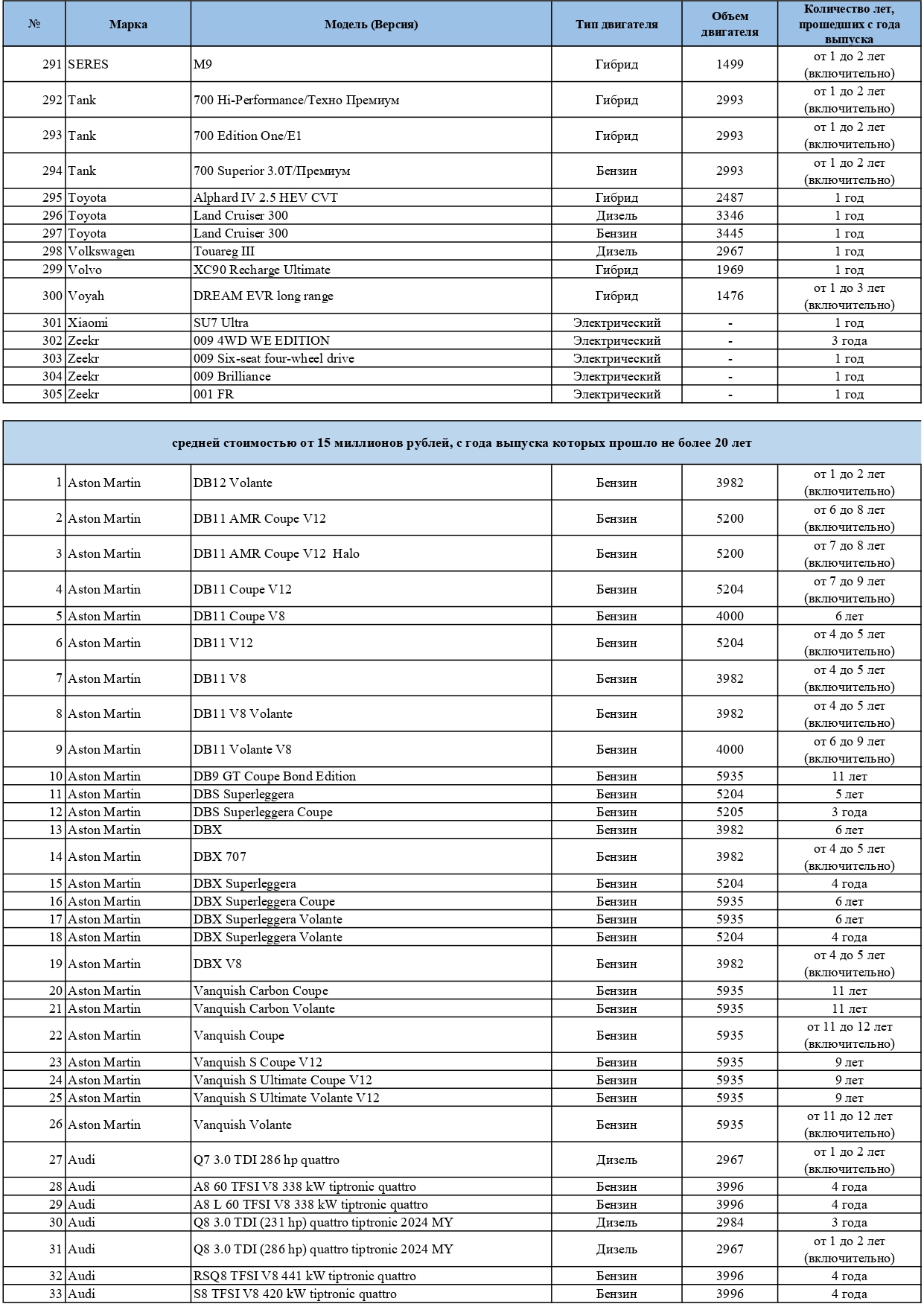 — 305 автомобилей средней стоимостью от 10 до 15 млн рублей