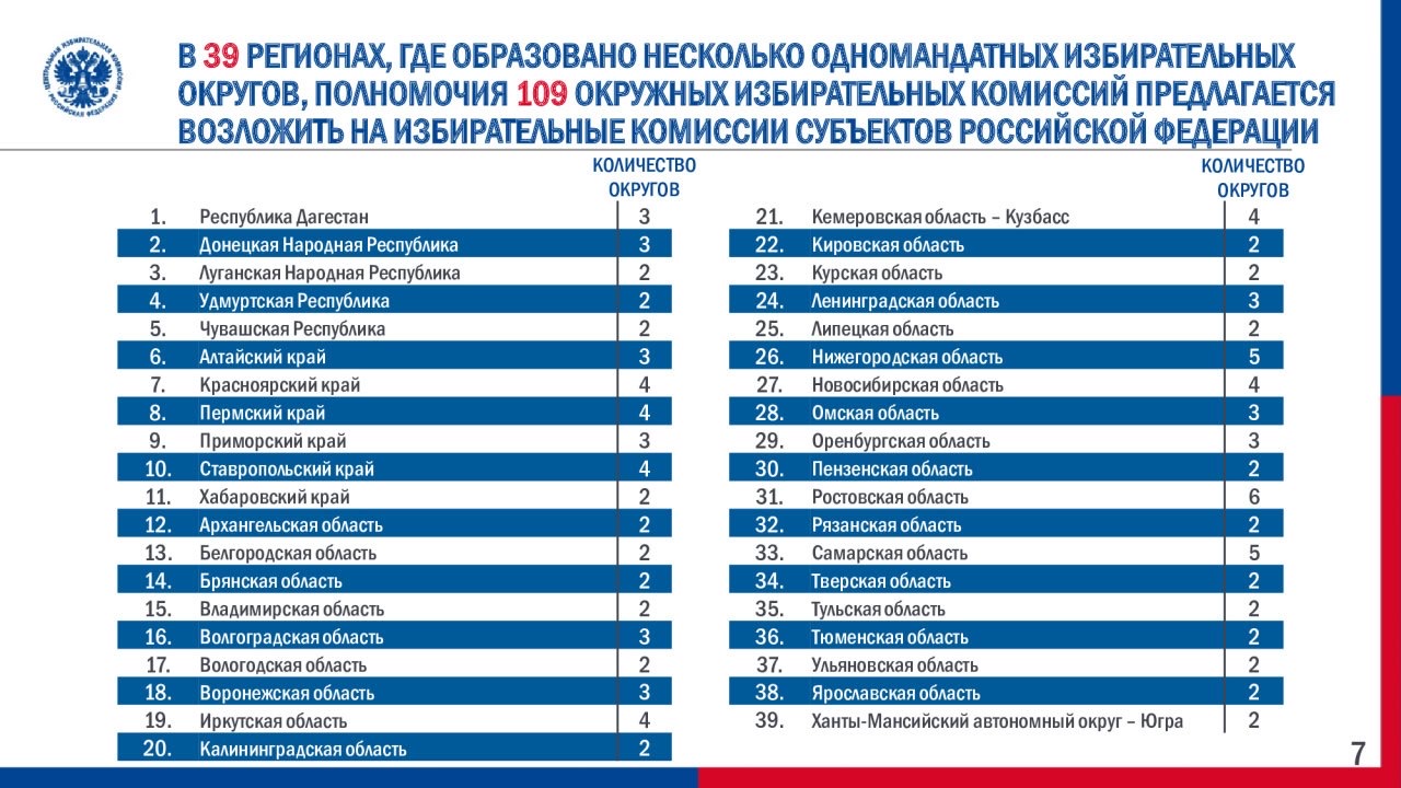 Всего в 39 субъектах с несколькими округами региональные избиркомы выполняют функции 109 окружных комиссий.