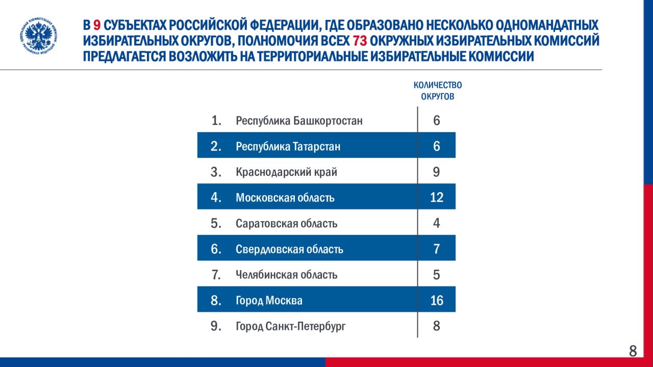 В субъектах, где округов больше одного, ЦИК определяет, кто будет выполнять эти полномочия — региональная комиссия или территориальная.