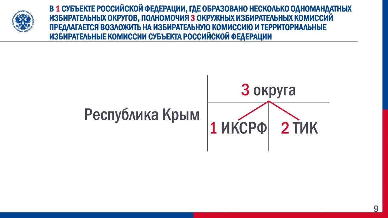 Отдельный порядок действует в Республике Крым: из трёх округов один закреплён за региональной комиссией, два — за территориальными избиркомами.