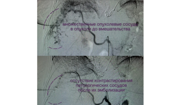 Из-за этого классическое хирургическое удаление оказалось невозможным. Врачи выбрали эндоваскулярный метод — через катетеры в питающие опухоль сосуды ввели эмболизирующий агент, перекрывающий кровоток. Такая процедура требует предельной точности, поскольку любое отклонение может привести к серьёзным последствиям.